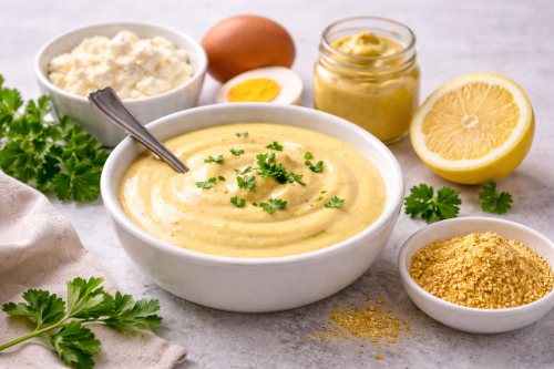 Blended cottage cheese is the unsung hero of breakfast sauces and nutritionally conscious food choices. It’s mild, creamy, and high in protein. And unlike yogurt, it doesn’t break or go runny when heated gently. We tossed in lemon juice, a little mustard, and boom — we were close! But not quite there yet.